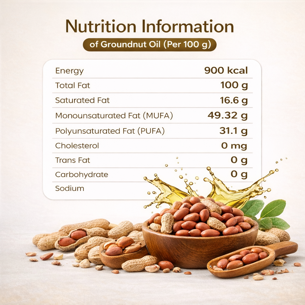 Nutrient-Rich Purity in Every Drop. Bring the goodness of the farm to your kitchen with our Wood Pressed Groundnut Oil. By avoiding high heat and factory chemicals, we preserve the essential Monounsaturated Fats (MUFA) and Polyunsaturated Fats (PUFA) found naturally in groundnuts. You taste the crop, not the factory.