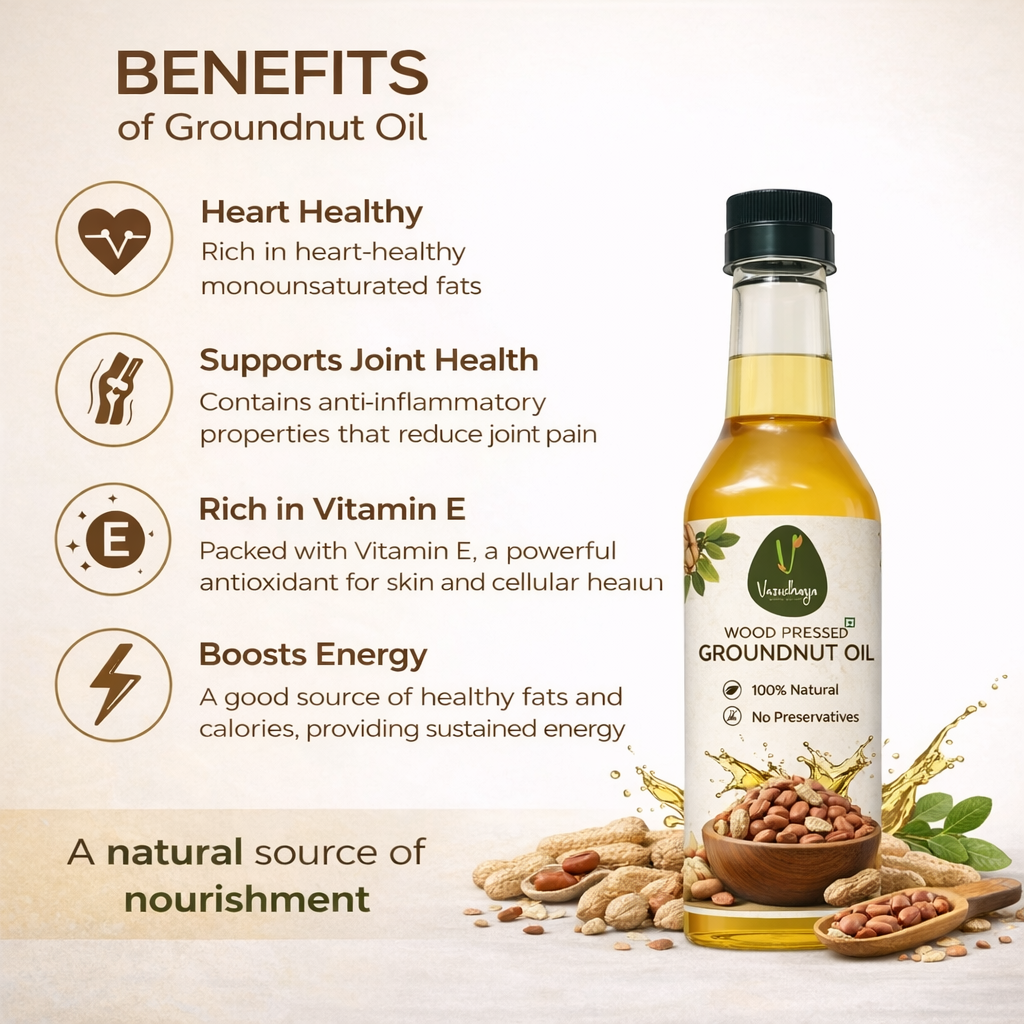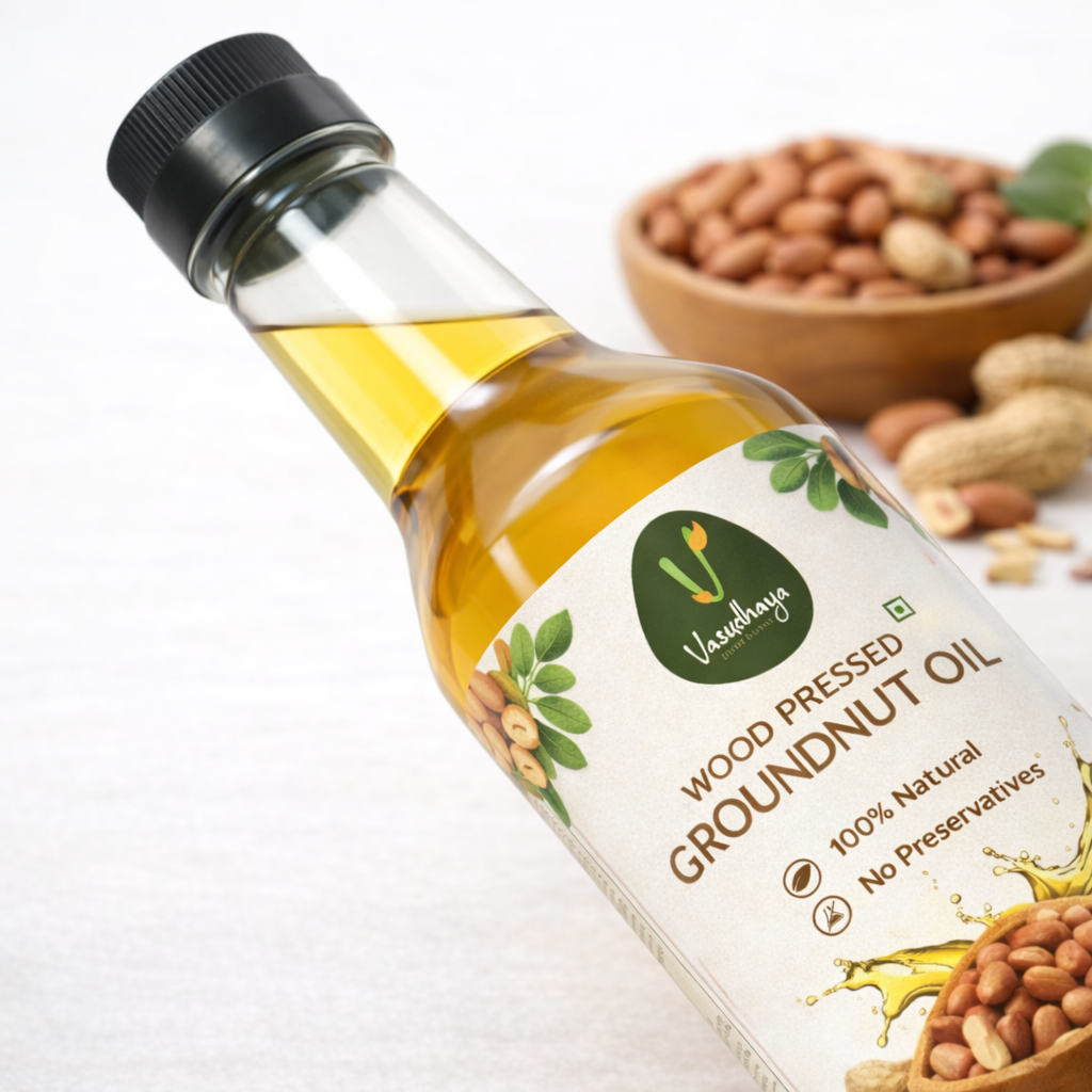 The Honest Taste of Home. Vasudhaya Wood Pressed Groundnut Oil is made from handpicked, sun-kissed groundnuts. We use a traditional slow-RPM wooden ghani (Kachi Ghani) to protect the oil’s gentle nutty notes and natural nutrients. It is 100% natural, unrefined, and free from any chemical processing.